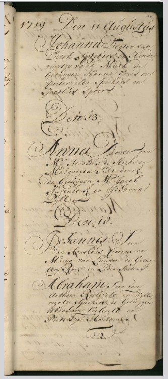 Als voorbeeld zoeken we de akte die moet bewijzen dat Abraham en Anthoni, allebei GENIII, broers zijn. In de doopakte van 18 augustus 1719 van een zoon van Anthoni zouden Abraham Roelevelt en zijn vrouw als getuigen genoemd moeten worden.